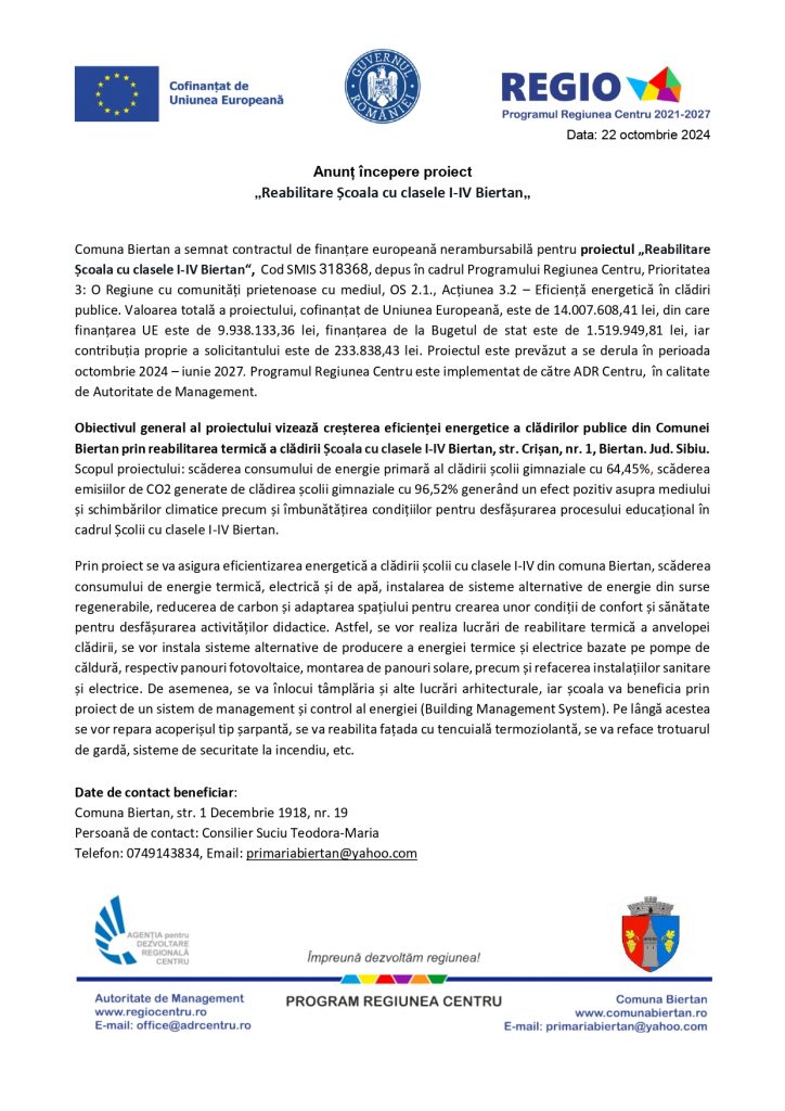 Anunț începere proiect Reabilitare Școala cu clasele I-IV Biertan COD SMIS 318368